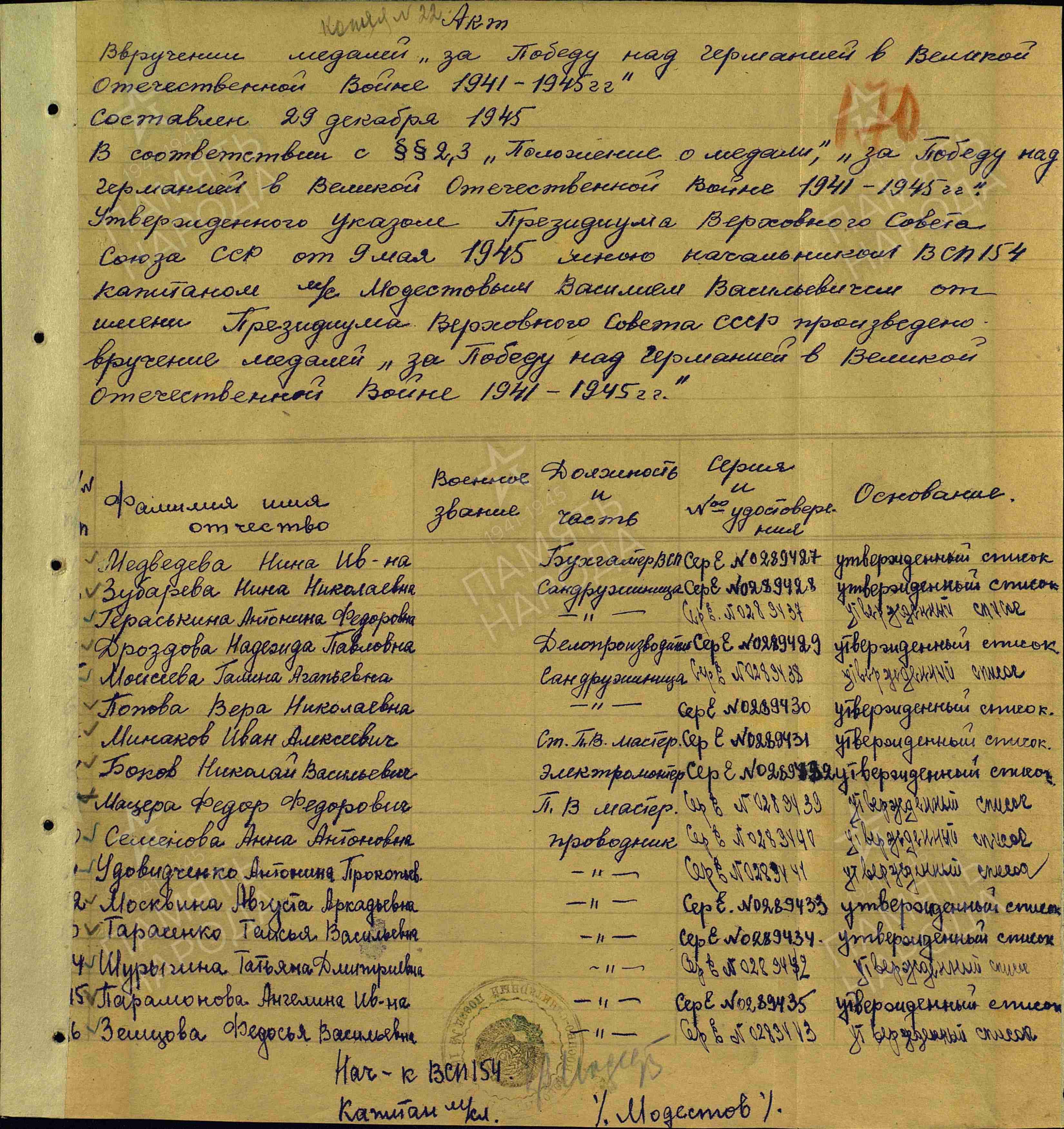 За доблестный труд в годы войны награждена медалью «За победу над Германией в Великой Отечественной войне 1941-1945». Медаль «За победу над Германией в Великой Отечественной войне 1941–1945 гг.» СПРАВКА: Учреждена Указом Президиума ВС СССР от 9 мая 1945 года. Награждались все военнослужащие и лица вольнонаёмного штатного состава, принимавшие непосредственное участие в рядах Красной Армии, Военно-Морского Флота и войск НКВД на фронтах Отечественной войны или обеспечивавшие победу своей работой. Приказ подразделения от: 29.12.1945 Издан: воен.-сан. поезд 154.